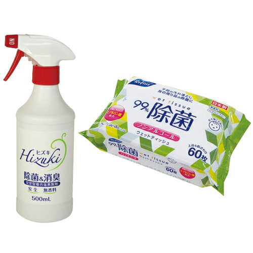 【あす楽対応】【正規代理店】【除菌・消臭スプレー】Hizuki(ヒズキ)除菌&消臭(安定型複合塩素製剤) 除菌&消臭スプレー 500mL + 【日本製】リファイン除菌ウェットティッシュ LD-109 (60枚入り) ノンアルコール - 無香料。手指の汚れ落とし。